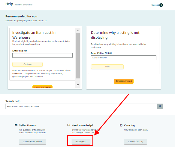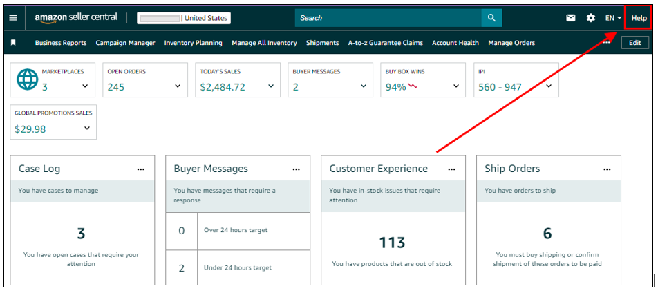- Click “Help” on the upper right corner of the Seller Central dashboard.