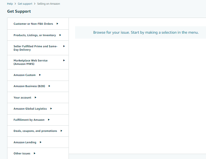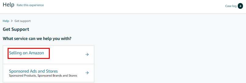 - On the Get Support page, click on “Selling on Amazon”