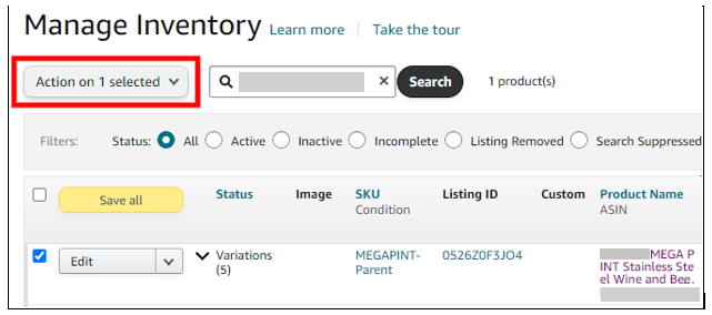 V. Click the “Action on 1 selected” button and choose “Delete products and listings”