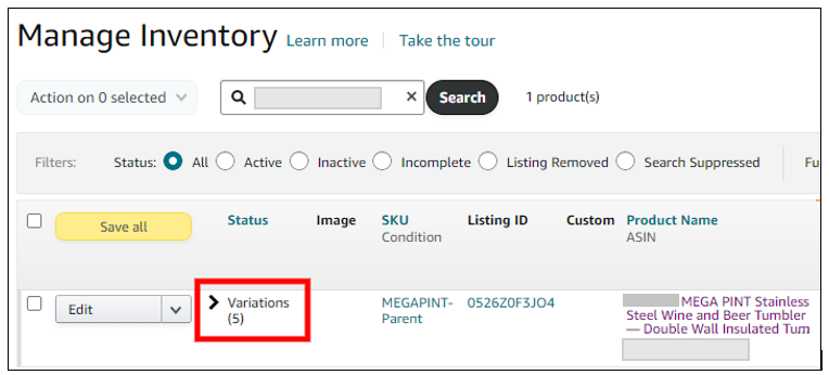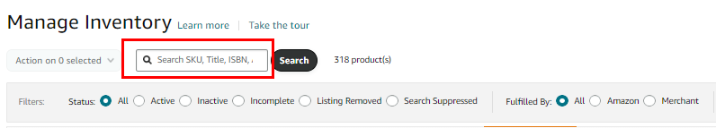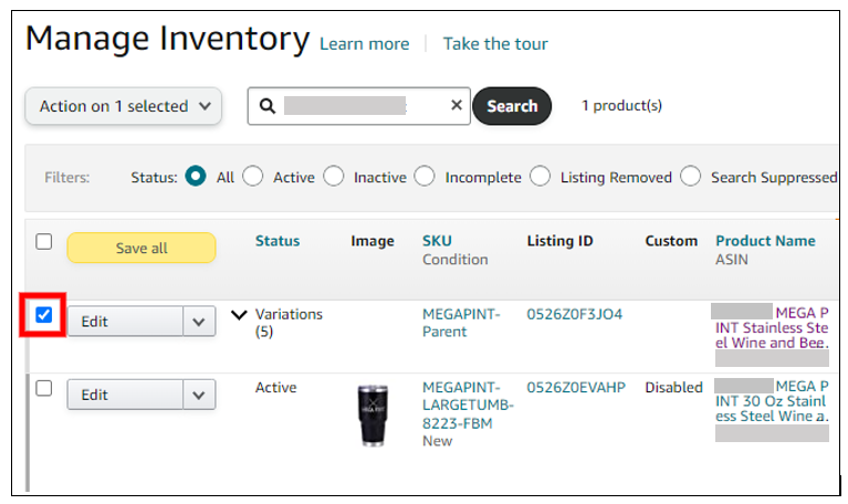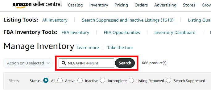 II. Search for the parent listing using the SKU or the ASIN, ensuring that the status and fulfillment status is set to All.
