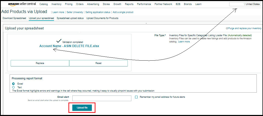 VIII. Once you fill out the two fields mentioned above, to Catalog > Add Products via Upload > Upload your Spreadsheet. Refresh the page first before attaching the file and make sure you’re on the right Amazon account. Then click Upload file.