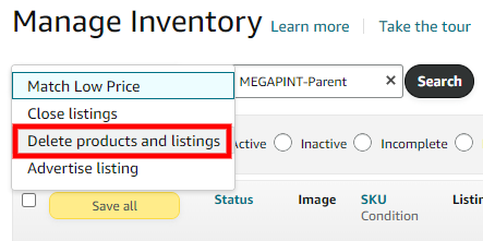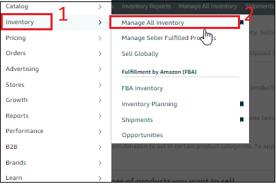 c. To confirm that SKU has been successfully deleted, go to the Inventory section, then select Manage All Inventory. From there, search for the SKU in question and confirm that it is no longer listed.