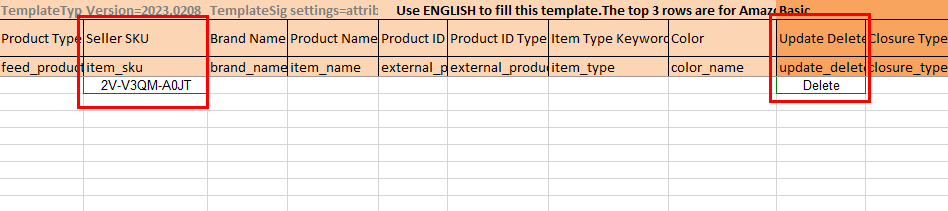 NOTE: When deleting a listing through a flat file, only the SKU of the item is to be deleted and the “update_delete” option needs to be filled in.