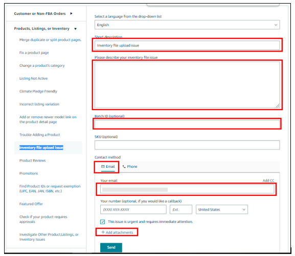 - Suppose we opt for "Inventory File Upload Issue". Complete the required information to submit a ticket. Next, provide a brief and clear explanation of the issue, and make sure to mention the Parent SKU/ASIN that you wish to break. Ensure that this information is included.