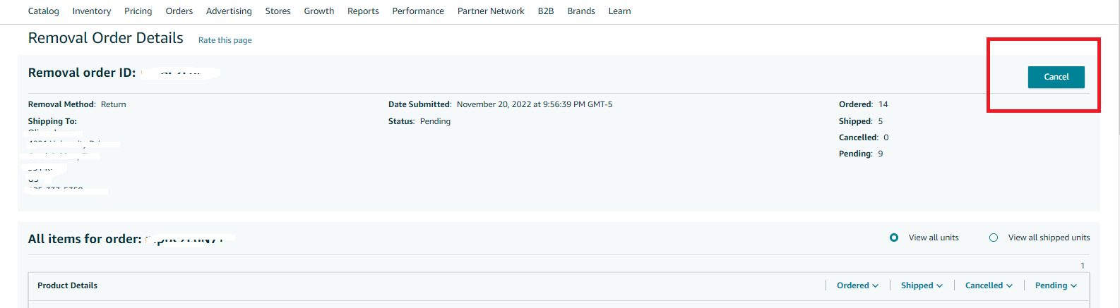 Sometimes Processing status orders cannot be canceled during peak periods such as Prime Day, Black Friday, Cyber Monday, and the holidays as the removal orders can stay in Processing status for several weeks. Sellers are not able to cancel a removal order for a required removal. For more information, go to Required Removals.