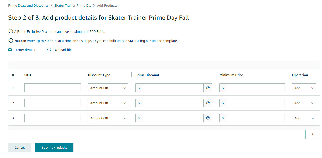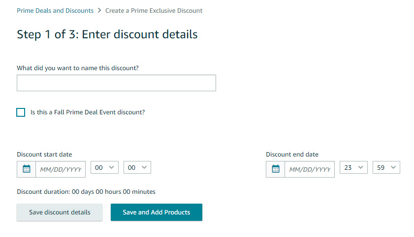 - If you are creating the discount for the Prime Deal Event, just tick the box before it. Type in the name of the discount for quick ID. Then click Save and Add Products.