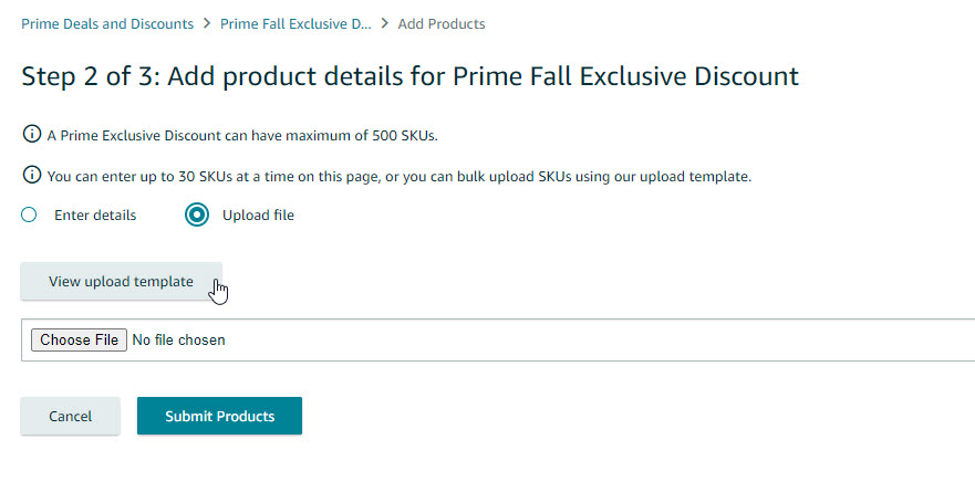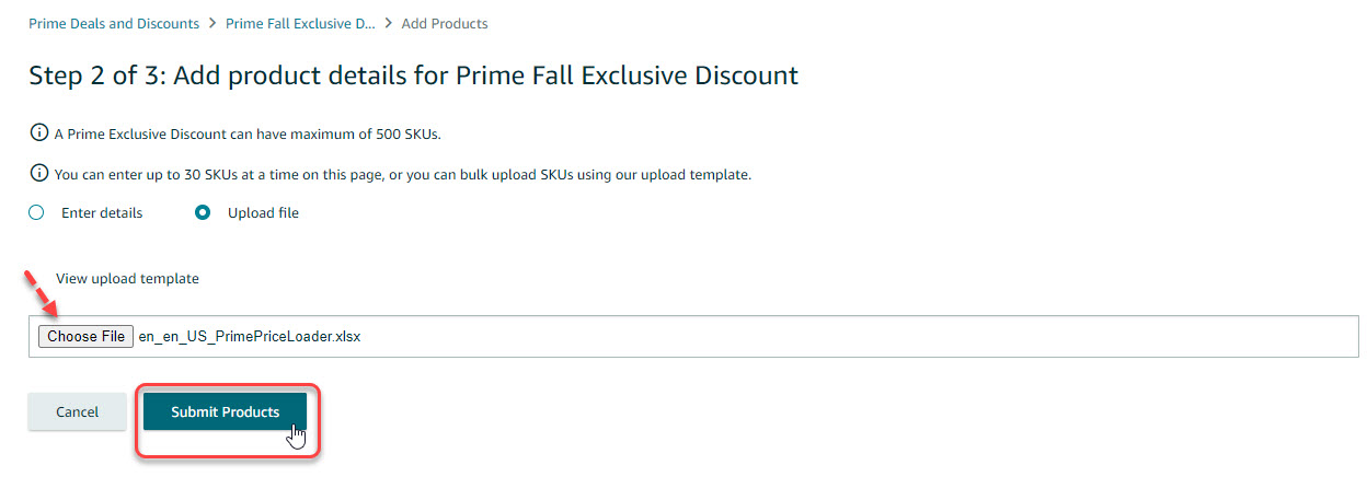 - Once completed, click Choose File and browse the filled-out template. Then click Submit Products.