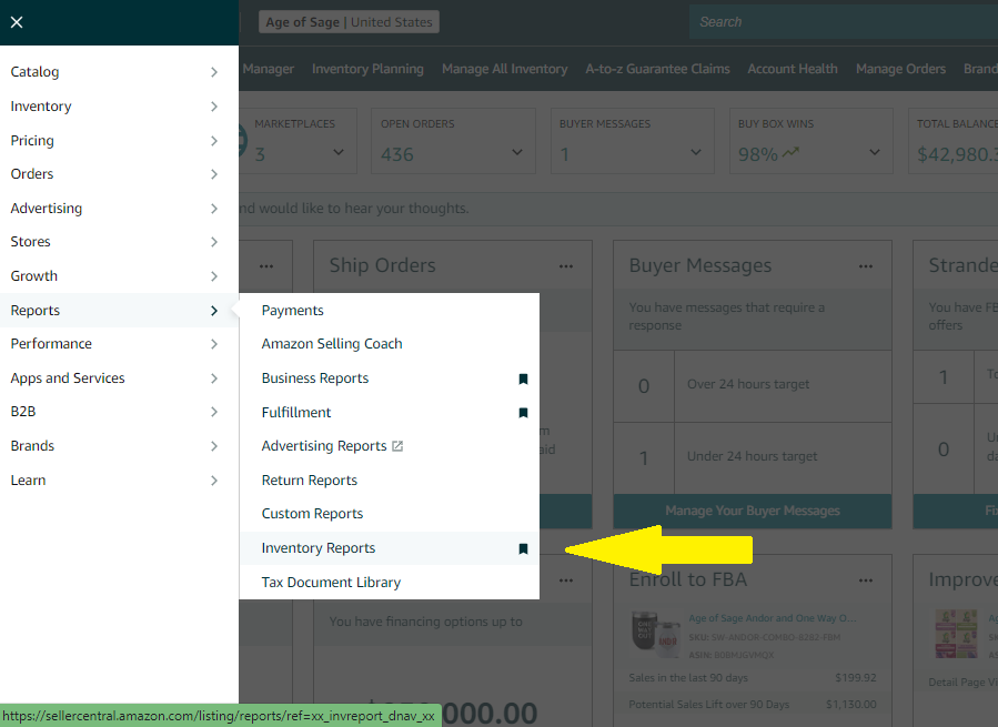 1. Access the “Report” tab from the top menu of Seller Central and select “Inventory Reports” from the selection Menu.