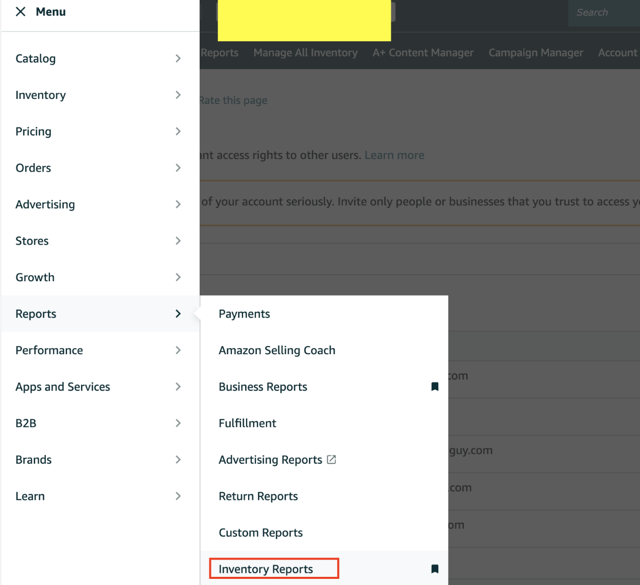 1. Log in to Amazon Seller Central. Click on the three-line bar located on the top left side, then select "Reports," and choose "Inventory Reports."
