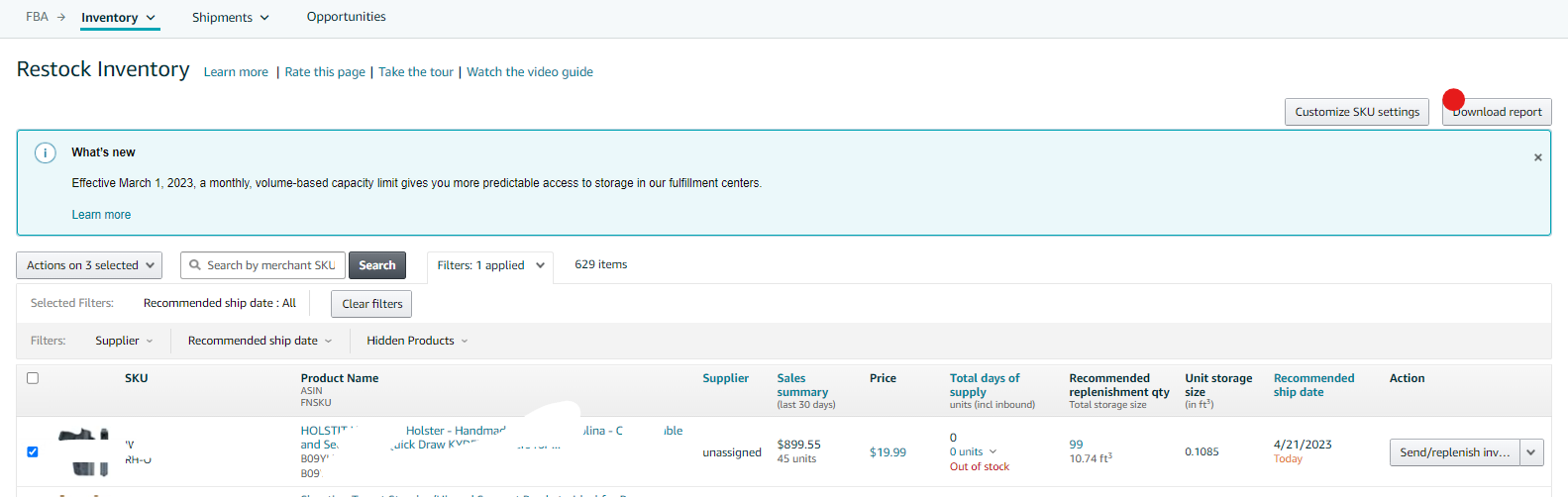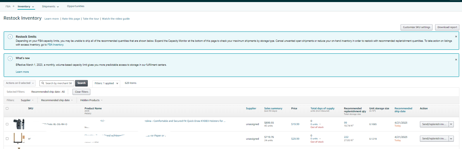 This will display a table with your SKUs, sales summary from the last 30 days, current consumer price on Amazon, days' worth of supply, inbound inventory, number of units on hand, and stock status. If Amazon is satisfied with the available units, there will be no considerations beneath the number of units in their Fulfillment Centers.