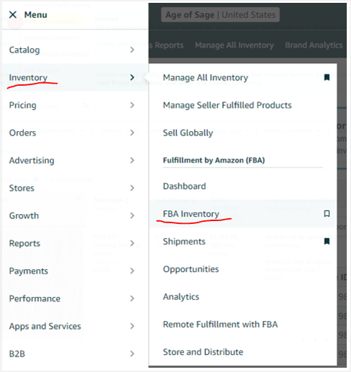 - Go to the "Inventory" tab on the top menu of Seller Central and select "FBA Inventory".