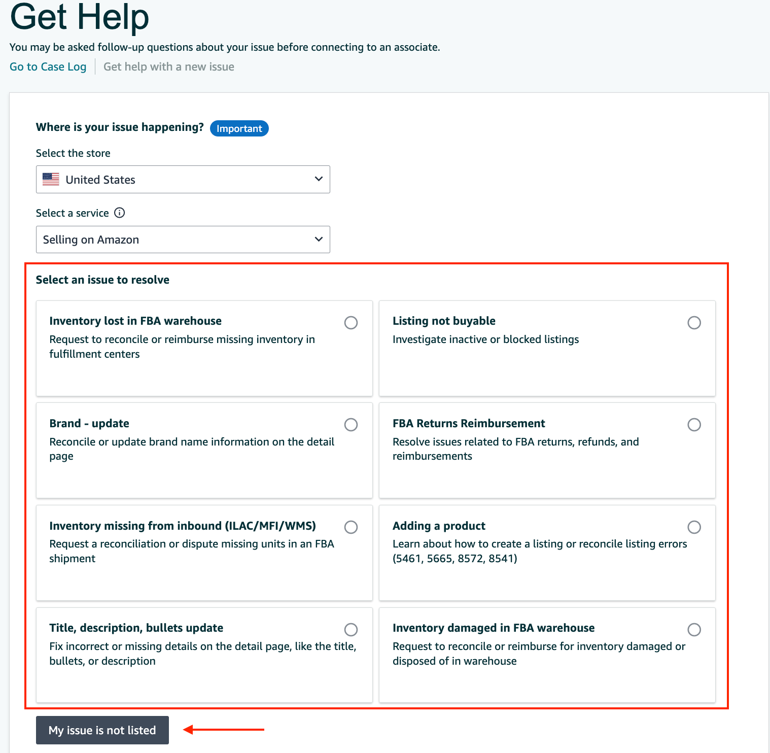 5. Click on a category that relates to the reason you're filing the case. For product information-related issues, choose "Products, Listings, or Inventory"