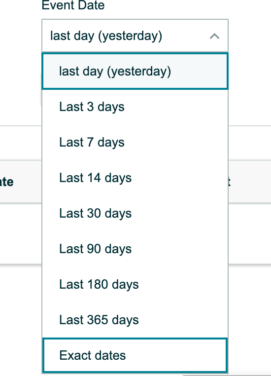 3. On the next page, choose the "Event Date" from the Drop-Down Menu Available or select "Exact Dates" and enter the "From" and "To" dates from the calendar icon.