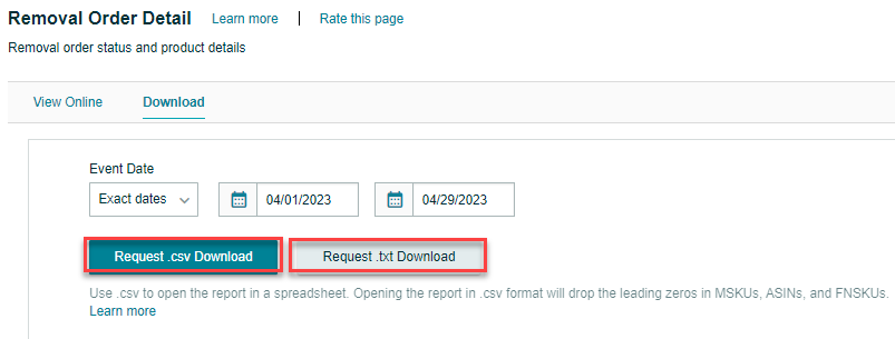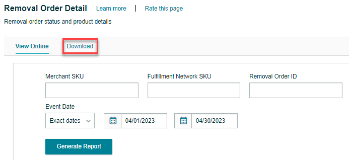 - On the following page, choose the event date by selecting from the drop-down menu or selecting "Exact Dates" and entering the "From" and "To" dates using the calendar icons. You can also enter your Merchant SKU, Removal Order ID, or Fulfillment Network SKU to generate a more specific report.