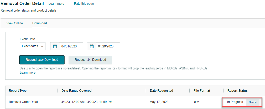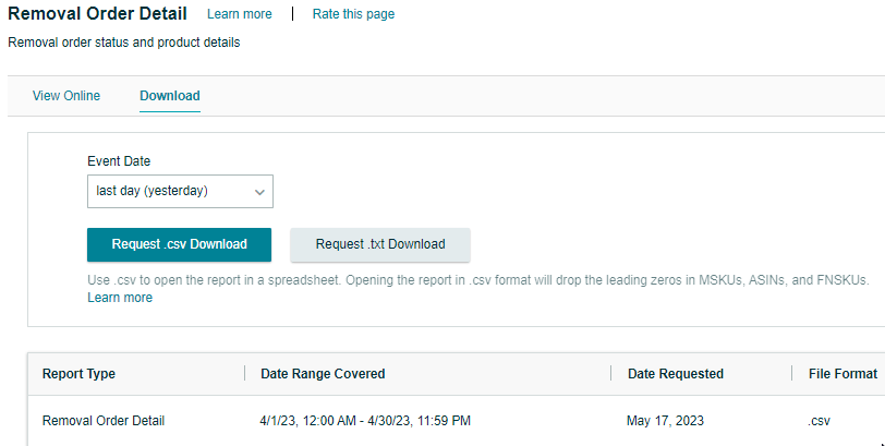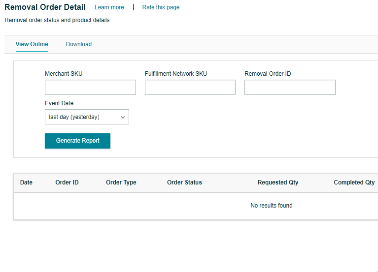 Objective: To guide sellers in generating a Removal Order Detail Report in Seller Central. The report provides crucial information about removal orders, including order type, order status, product information, removal fees, and tracking information for returns.