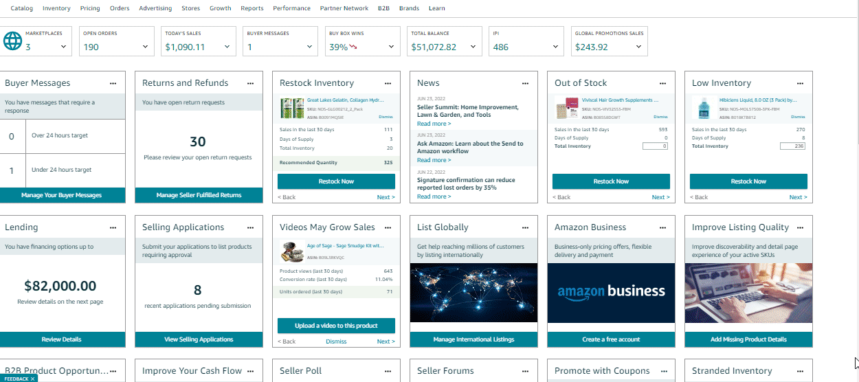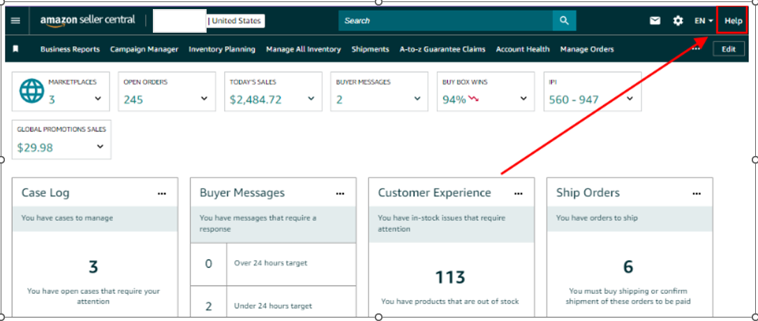 - Click “Help” on the upper right corner of the Seller Central dashboard.