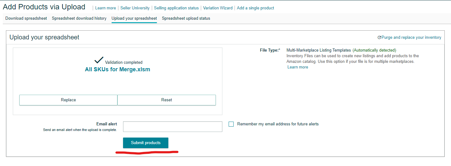 Go to Inventory > Add Products via Upload > Upload your inventory file. Refresh the page first before attaching the file, and make sure you’re on the right Amazon store. Then click "Upload File."
