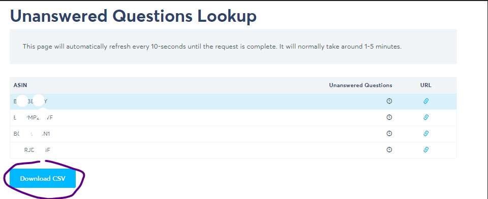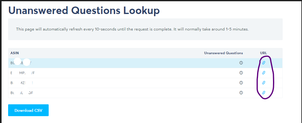 5. Download the list by clicking the “Download CSV” button on the lower left side of the page. This will give you a copy of the ASINs with unanswered questions. Paste it on a separate sheet.