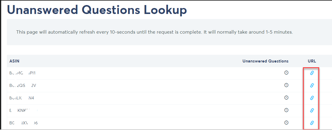 6. Manually check the links by clicking the URL icon on the right side of the lists to see the number of unanswered questions on each asin. Log in on the sheet you made.