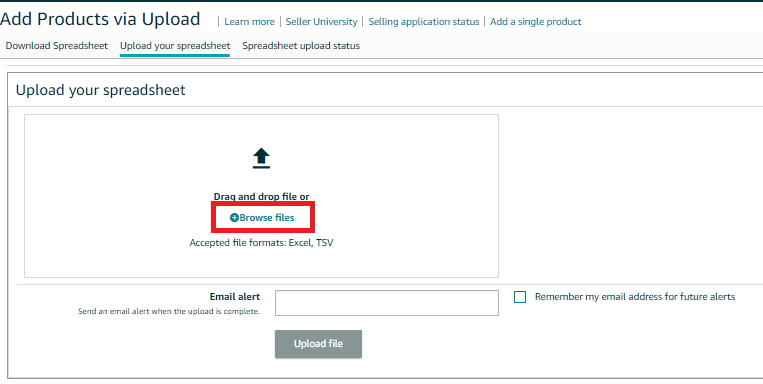 9. Once done, save the flat file and upload it on Seller Central. Go to Catalog > Upload your Spreadsheet. Refresh the page first before attaching and make sure you’re on the right Amazon store. Drag and drop your file or browse from your computer and attach it. Then click “Upload file”.