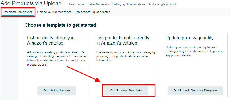 3. Go to ‘Download Spreadsheet.’ The landing page will look like the screenshot below. Under "Update product details" click "Get Product Template", then click product template.