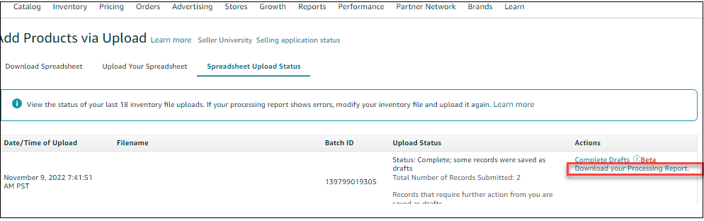 10. Monitor the status of your feed load and download the processing report right after. Check for any errors and troubleshoot them as needed.