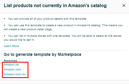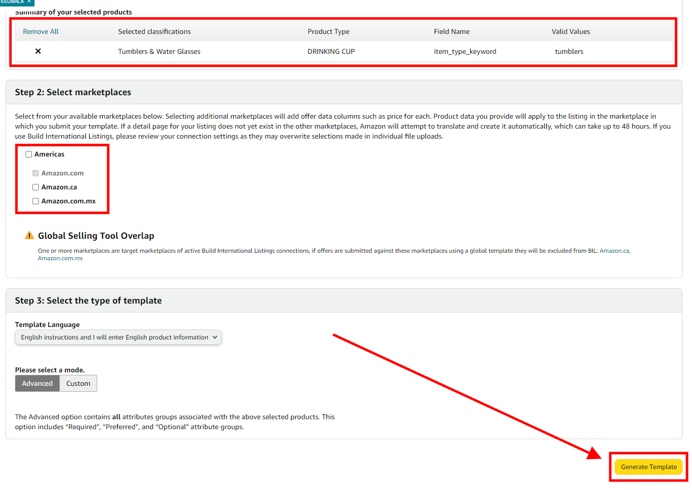 6. Once the correct category is selected, tick the correct marketplace (.com for the US, .ca for Canada, and .mx for Mexico) and click “Generate Template”.