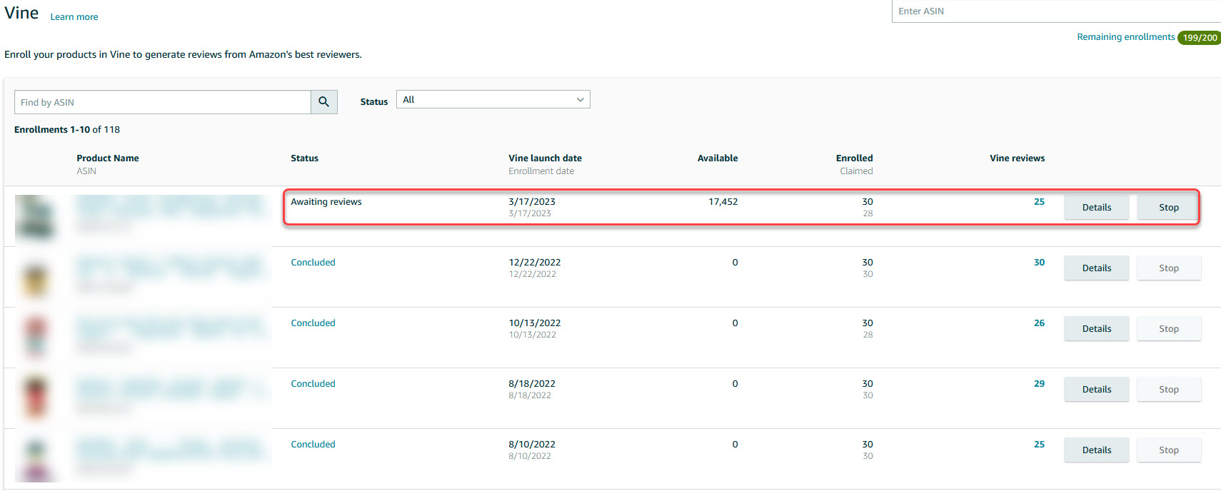 5. You can edit specific aspects of your enrollment, such as canceling the enrollment, by clicking the "ASIN link" or "Details" button of enrolled products.