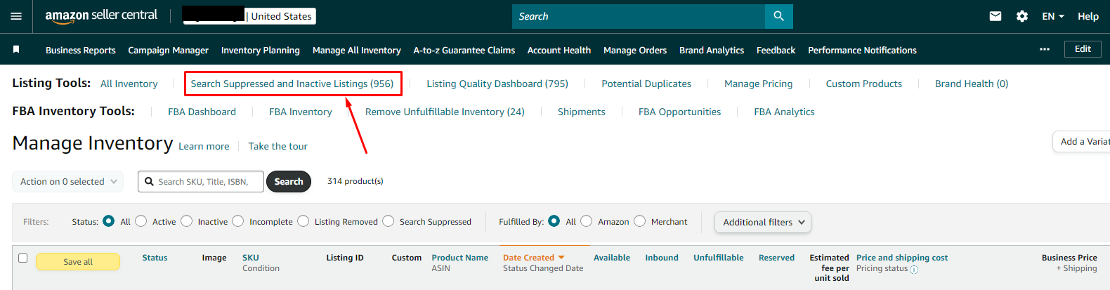 - Go to the "Manage Inventory" page in Seller Central by selecting it from the drop-down menu under the "Inventory" tab.
