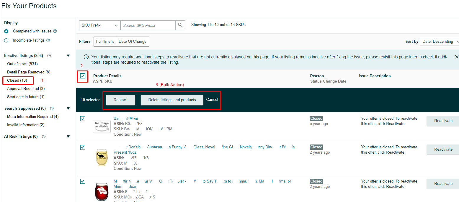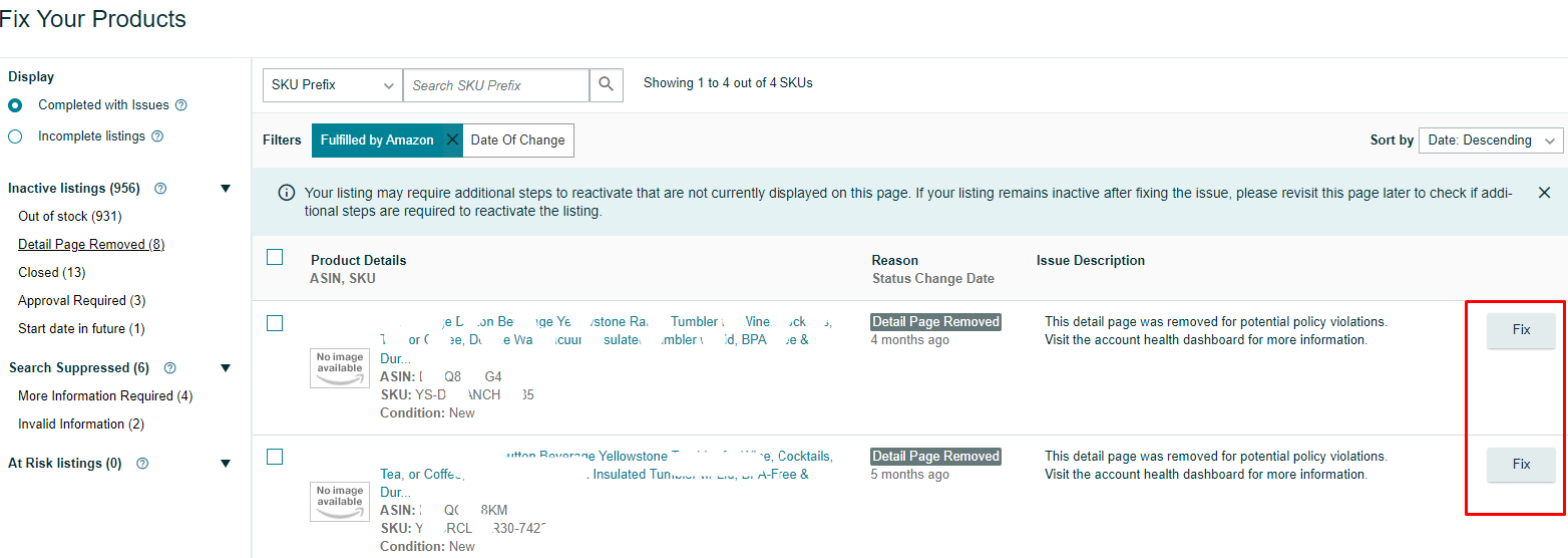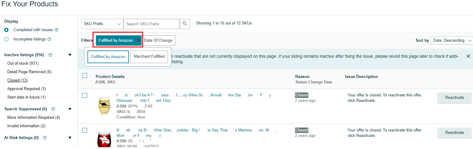 - Filter by fulfillment type to Fulfilled By Amazon or Merchant Fulfilled. Each line item displays the inactive reason, issue description, and fix issues.