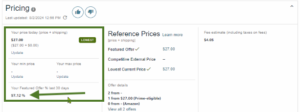 Note : For this Option you can not see the winning rate for the Featured Offer. If you wish to see your Winning Rate click on the SKU then scroll down until the “Pricing” portion.