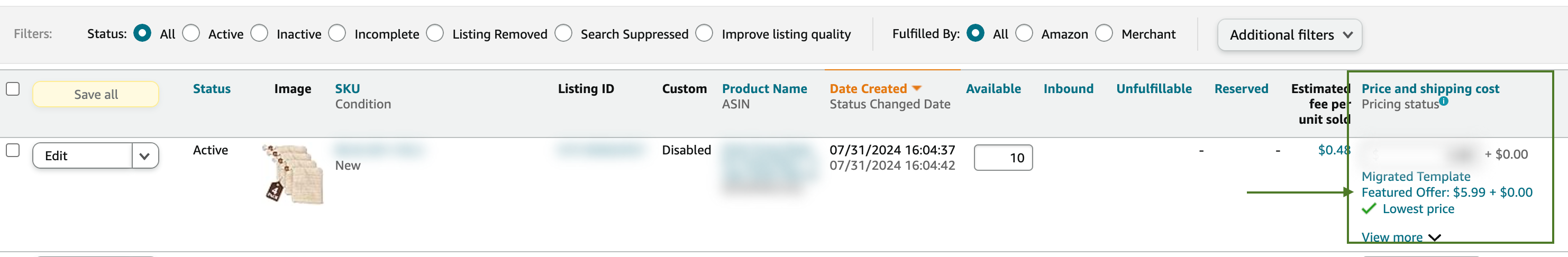 Select the listing you want to check and go to the “Price and Shipping cost “column to see the Featured Offer price