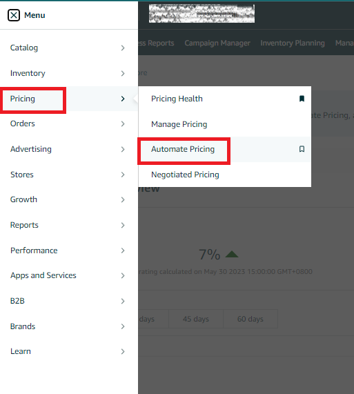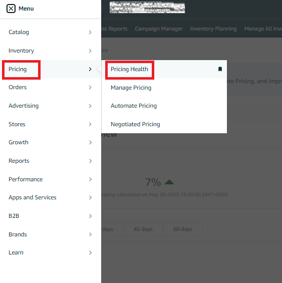 1. To access the pricing dashboard in Seller Central, select "Pricing Health" from the dropdown menu under the "Pricing" tab.