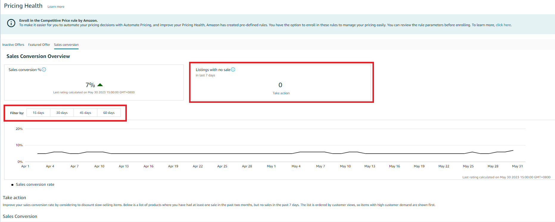 5. To increase sales conversion, you can consider discounting slow-selling items or enrolling in Automate Pricing to adjust prices based on sales volume.