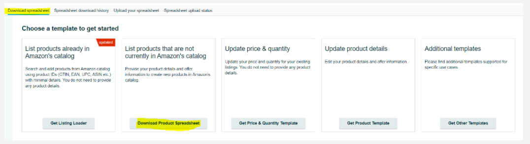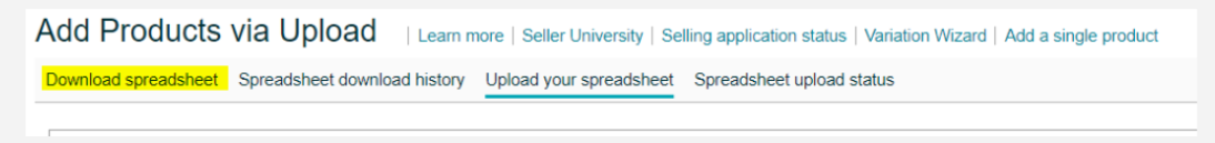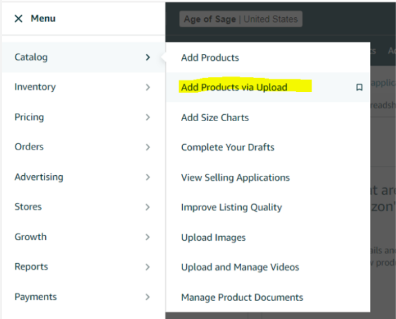 On Seller Central's Home page, click the hamburger icon (top left) and go to Catalog > Add products via upload.