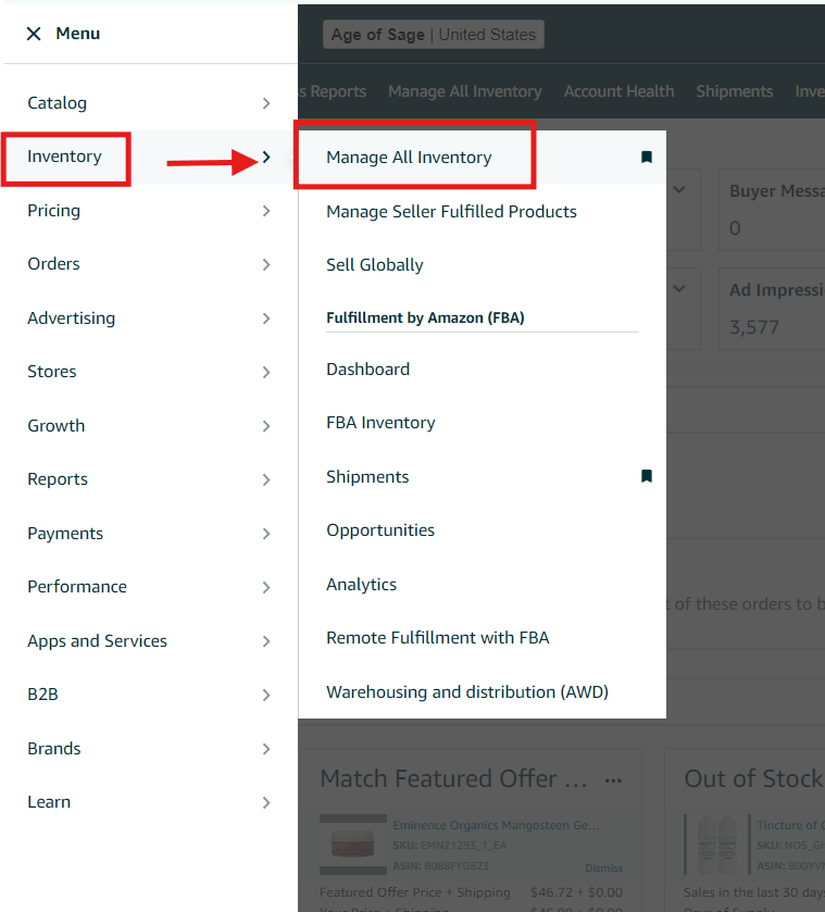 From the Inventory drop-down menu in Seller Central, select Manage All Inventory.