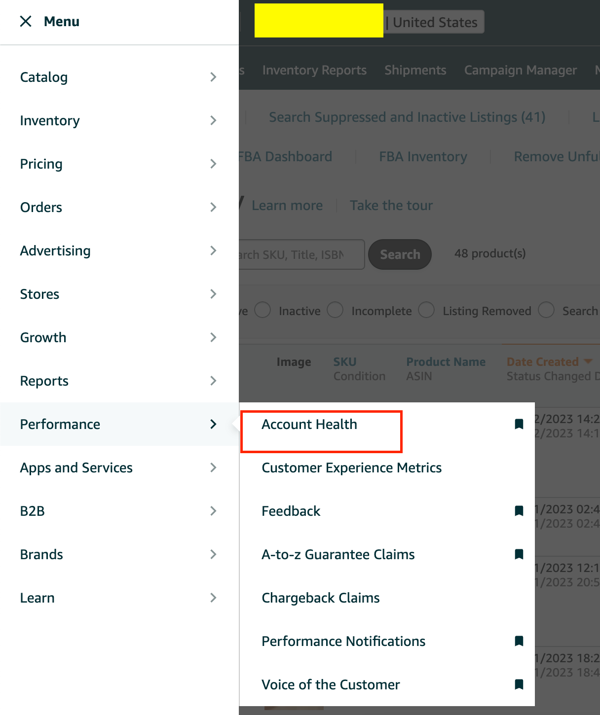 Go to the "Performance" tab in Seller Central and select "Account Health" from the drop-down menu.