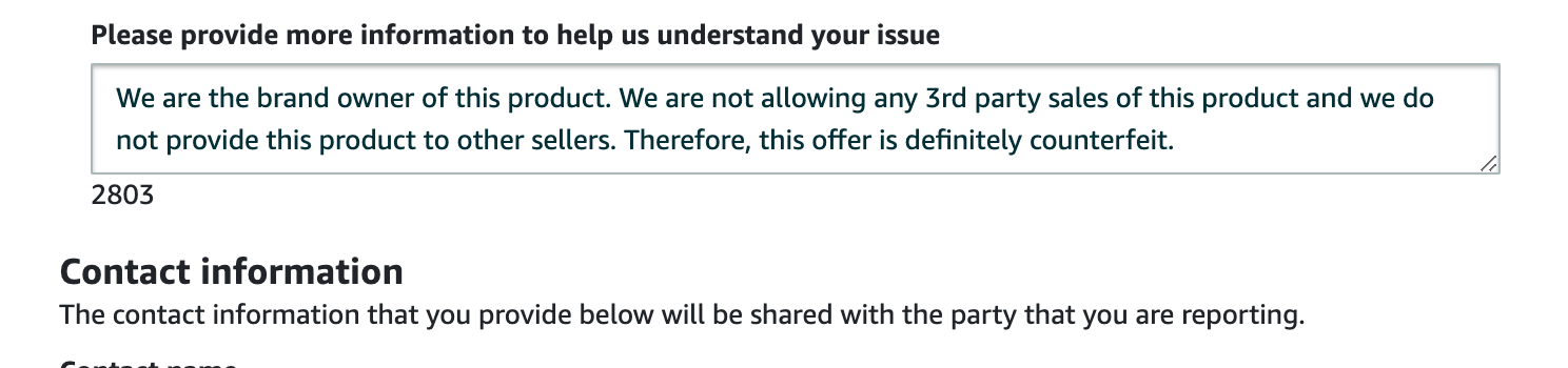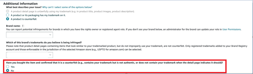 - Select the “Product is counterfeit” option: