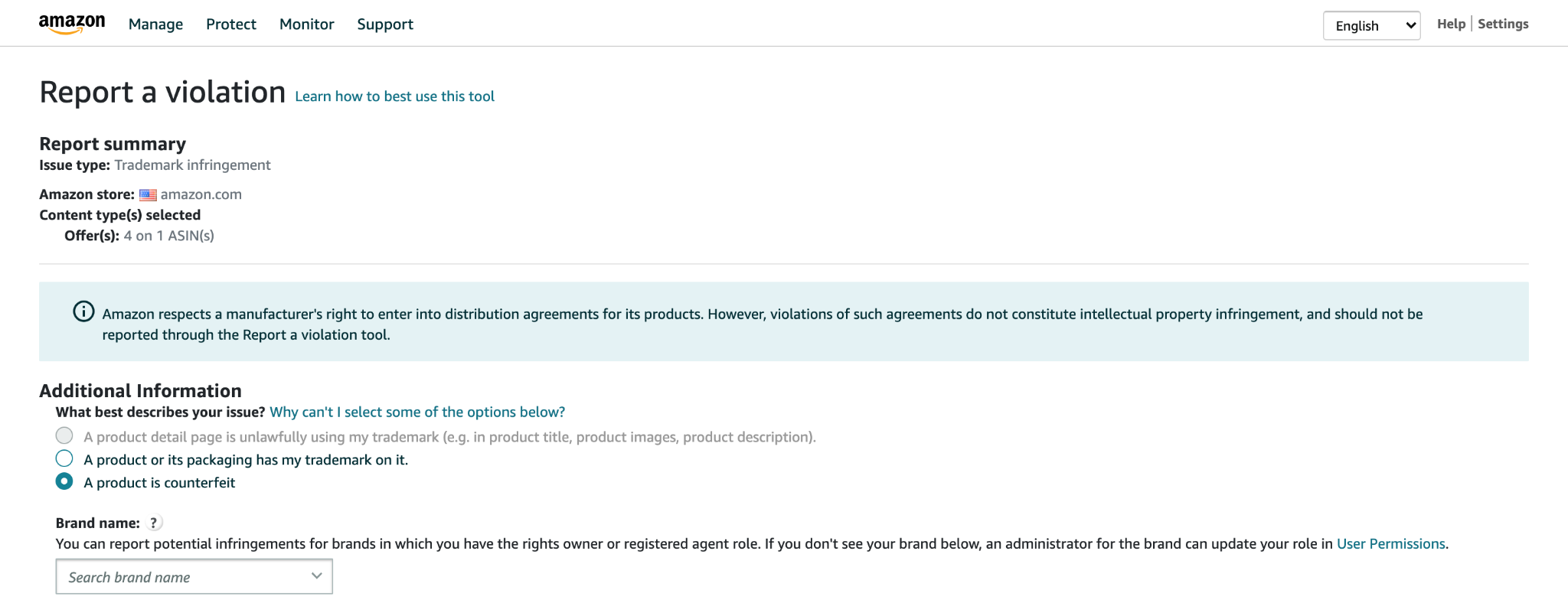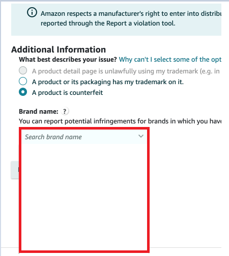 - Click on “Trademark infringement” under the “Select issue type” dropdown menu: