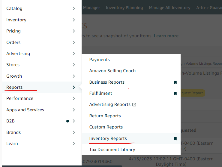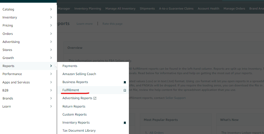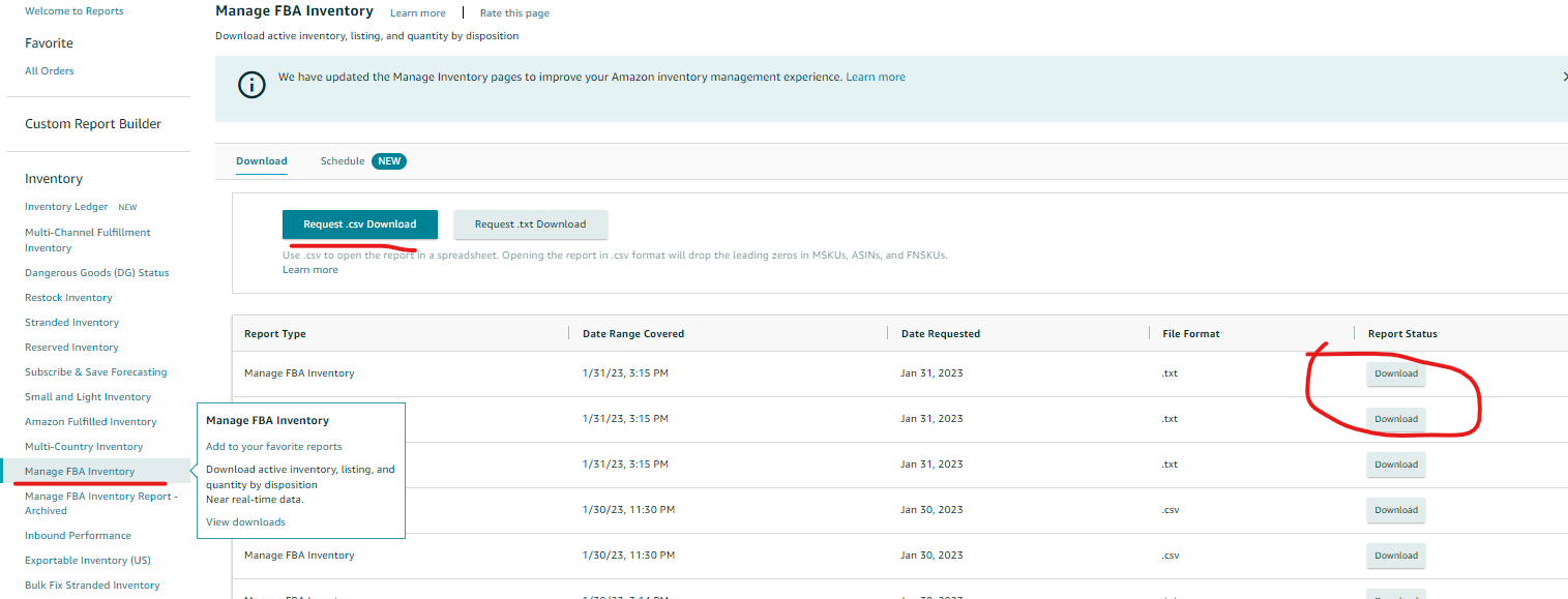 3. Next go to Reports → Fulfillment → Inventory → Manage FBA inventory, Request and Download as txt/csv.
