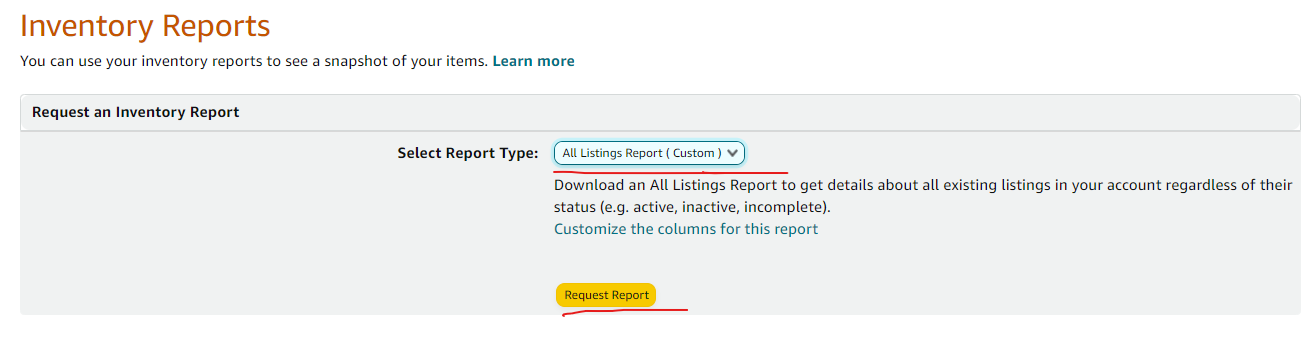 - Go back to Inventory Reports, All Listings Report, and then click the Request Report button.
