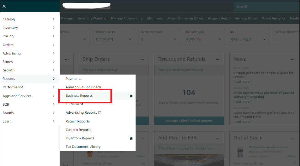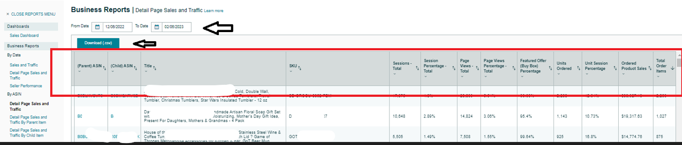 2. Go to Reports → Business Reports, and click Detail page sales and traffic by ASIN. Get the previous 2 months' data and download it. (Remove any B2B data and only the following data columns should be included in this report.)