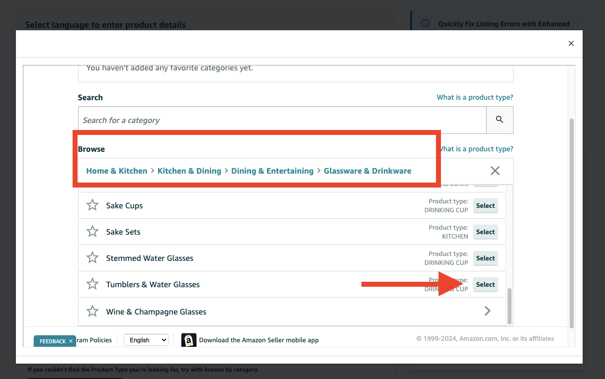 6. Browse the correct subcategory based on how it was displayed on the PDP. i.e.: Home & Kitchen › Kitchen & Dining › Dining & Entertaining ›Glassware & Drinkware › Tumblers & Water Glasses.