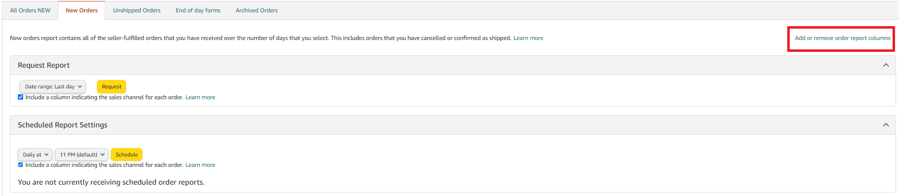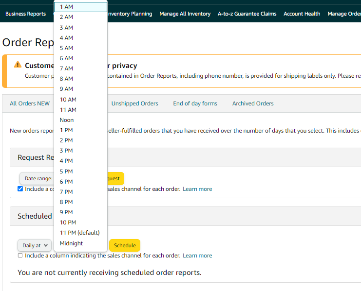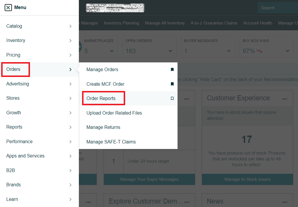 1. To schedule a New Orders Report, navigate to the "Orders" tab on the top menu of Seller Central and select "Order Reports" from the drop-down menu.