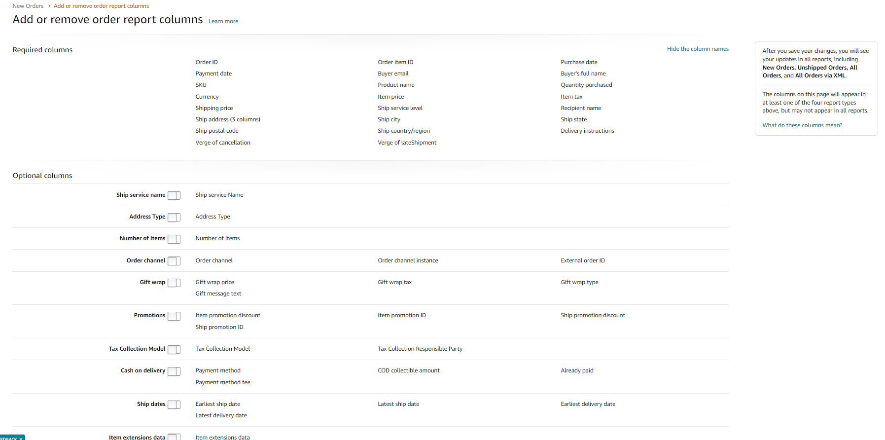 5. Before scheduling the report, you may also add or remove columns by clicking the "Add or remove order report columns" link in the page's top right corner and selecting the desired fields.