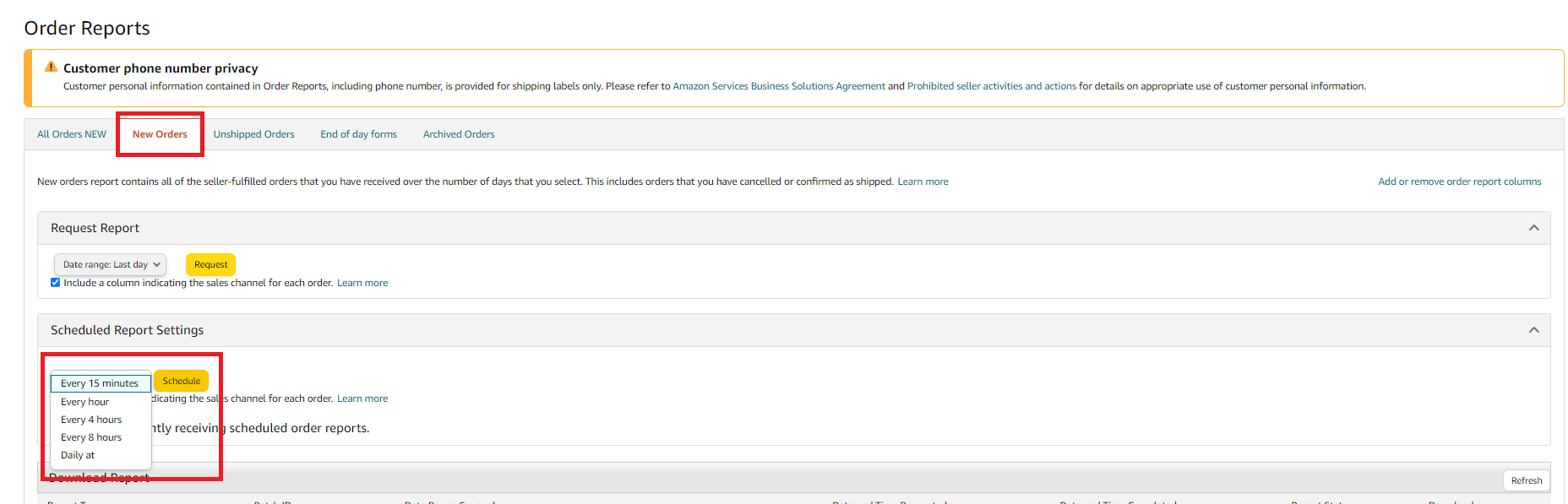 2. Under the "New Orders" tab, go to the "Scheduled Report Settings" heading and select the desired schedule for your report, then click the "Schedule" button.