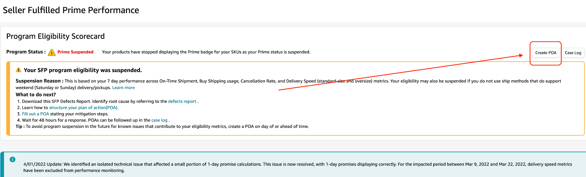 Plans of Action can be submitted by clicking the Create POA button on the Seller Fulfilled Prime Performance dashboard.