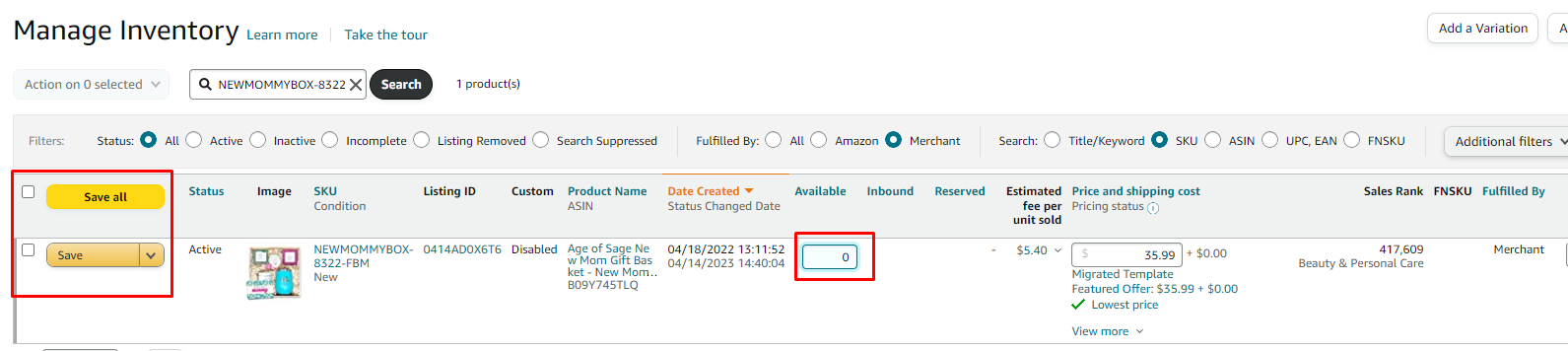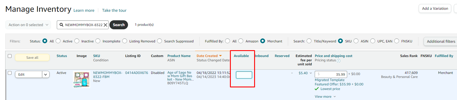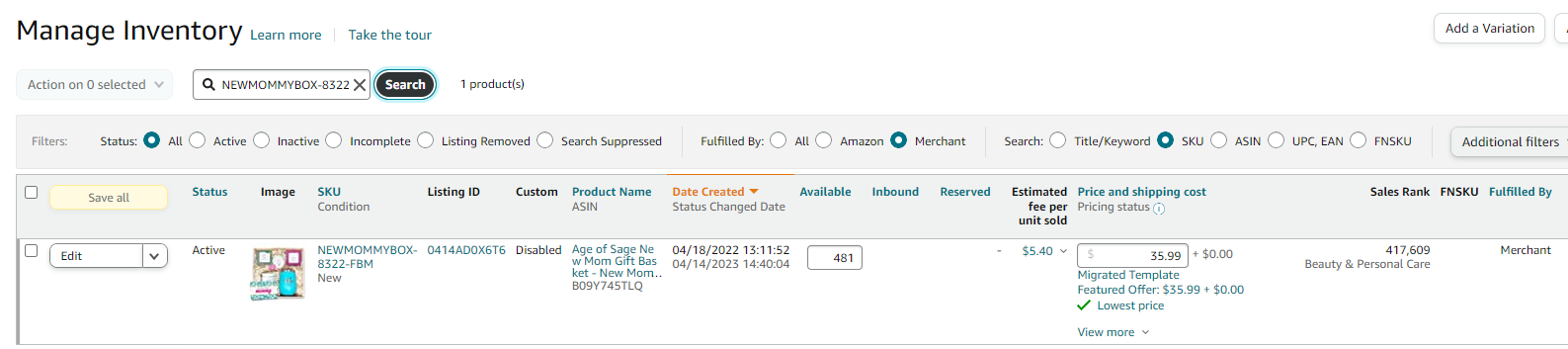 - Find your new SKU, which should now be listed as Seller/Merchant Fulfilled.