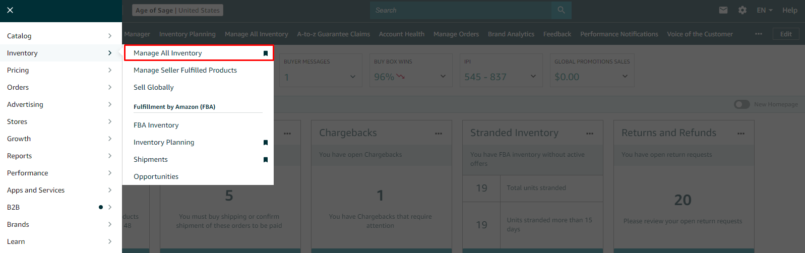 - Go to Seller Central's top menu and select "Inventory," then click on "Manage Inventory" from the dropdown menu.