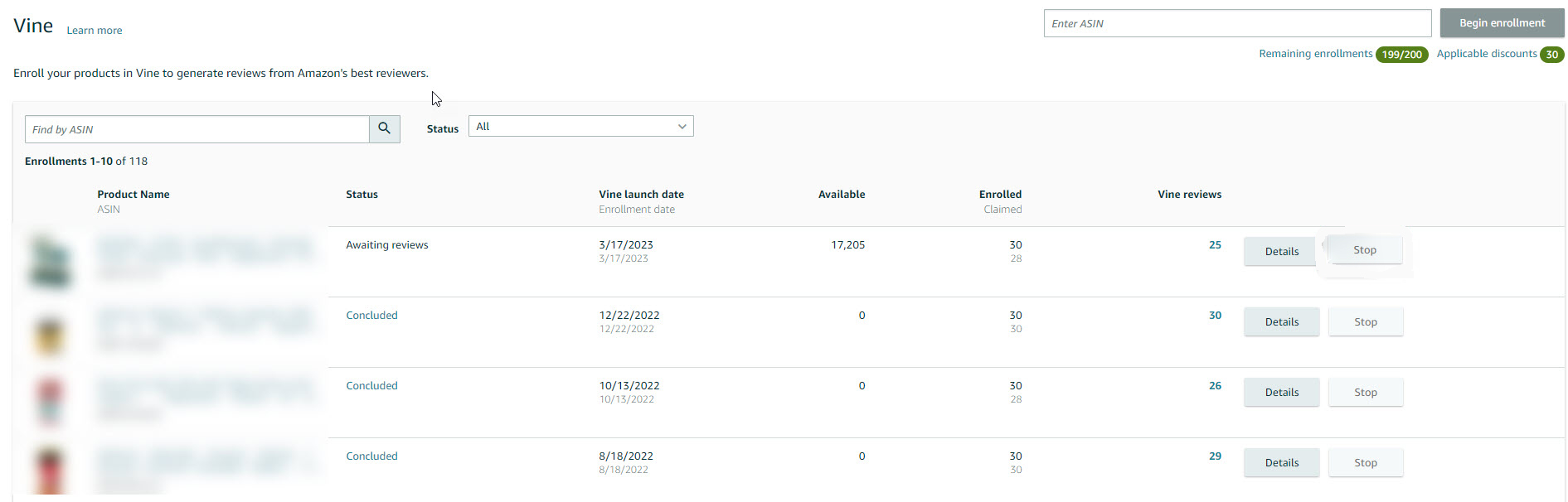 - On the next page, you can find information such as the date you enrolled the product in Vine, the number of units available for Vine Voices to request, the number of units you enrolled, the number of units Vine Voices claimed, and the number of Vine reviews published for your most recent enrollments. This information is located near the bottom of the page.